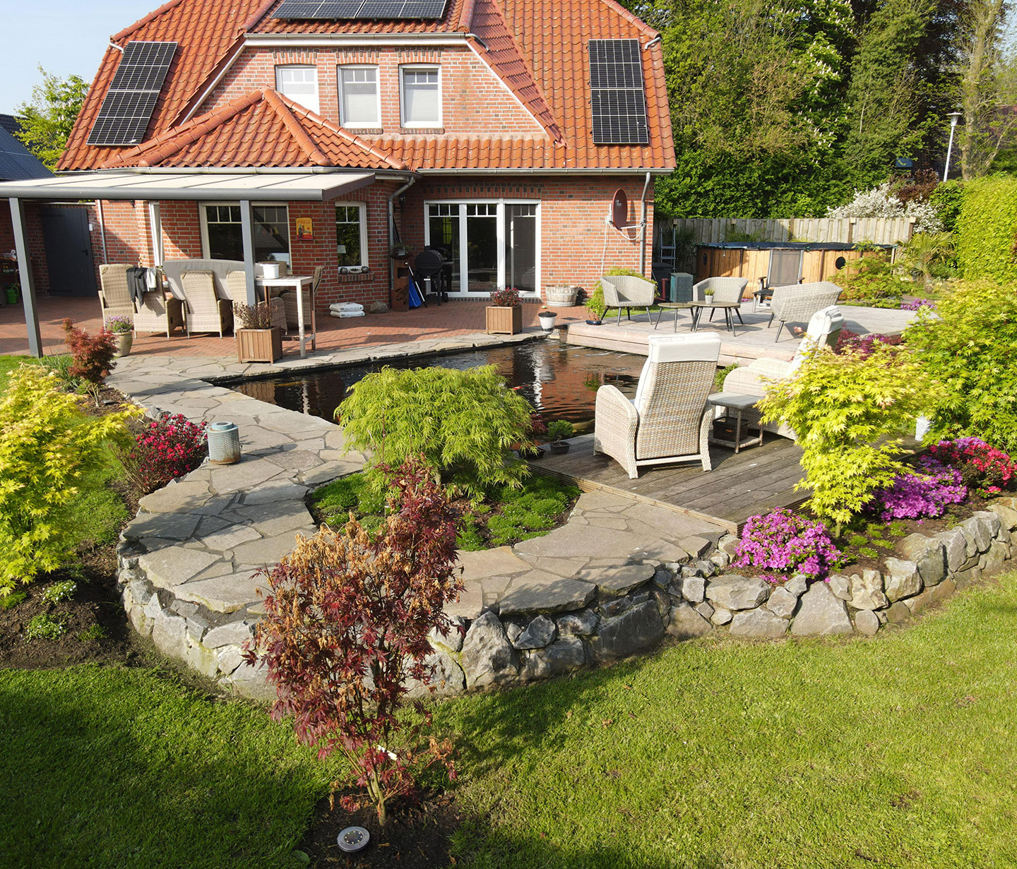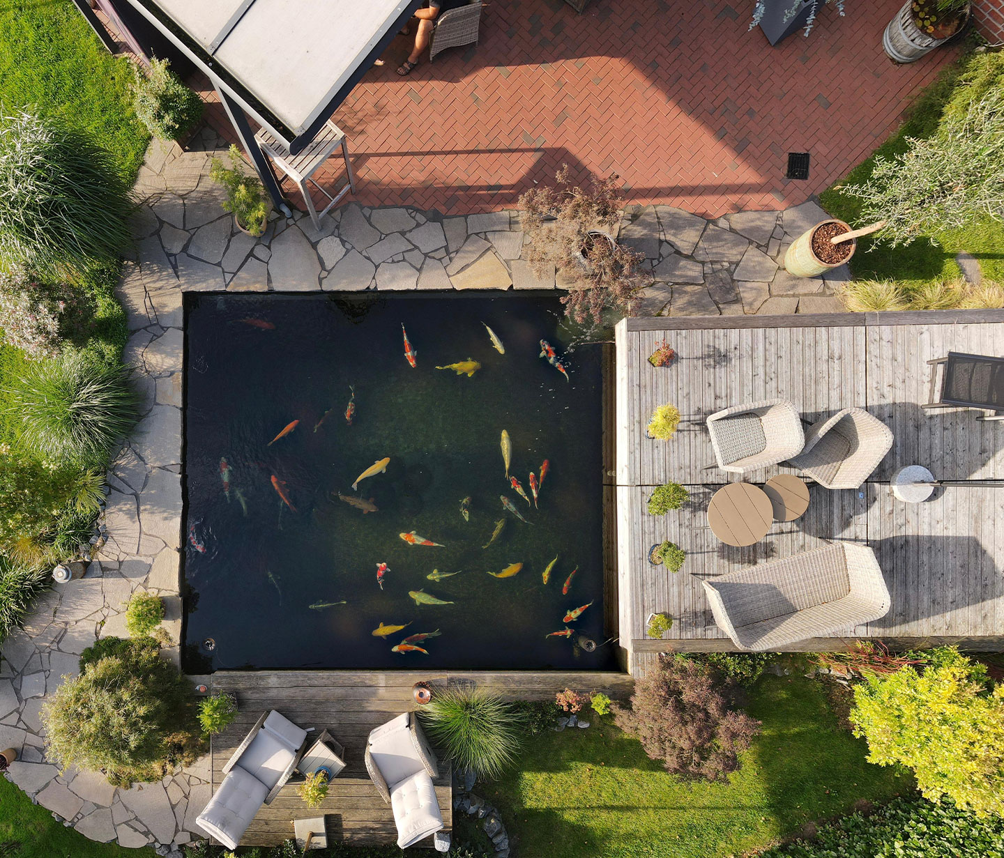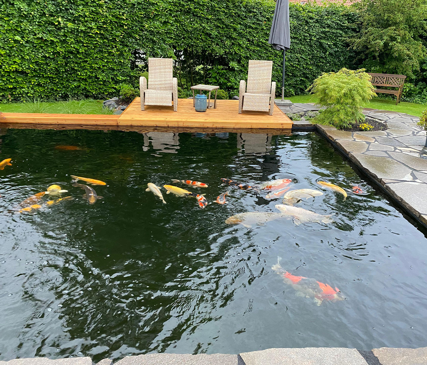 Der Teich wurde mit klarer Linienführung und schlichter Eleganz gestaltet. Mehrere Sitzplätze rund um den Teich laden dazu ein, die majestätische Bewegung der Koi hautnah zu erleben. Einedurchdachte Teicharchitektur mit harmonisch abgestimmter Bepflanzungschafft einen stilvollen Rahmen, in dem die Farbenpracht der Fische besonders gut zur Geltung kommt.