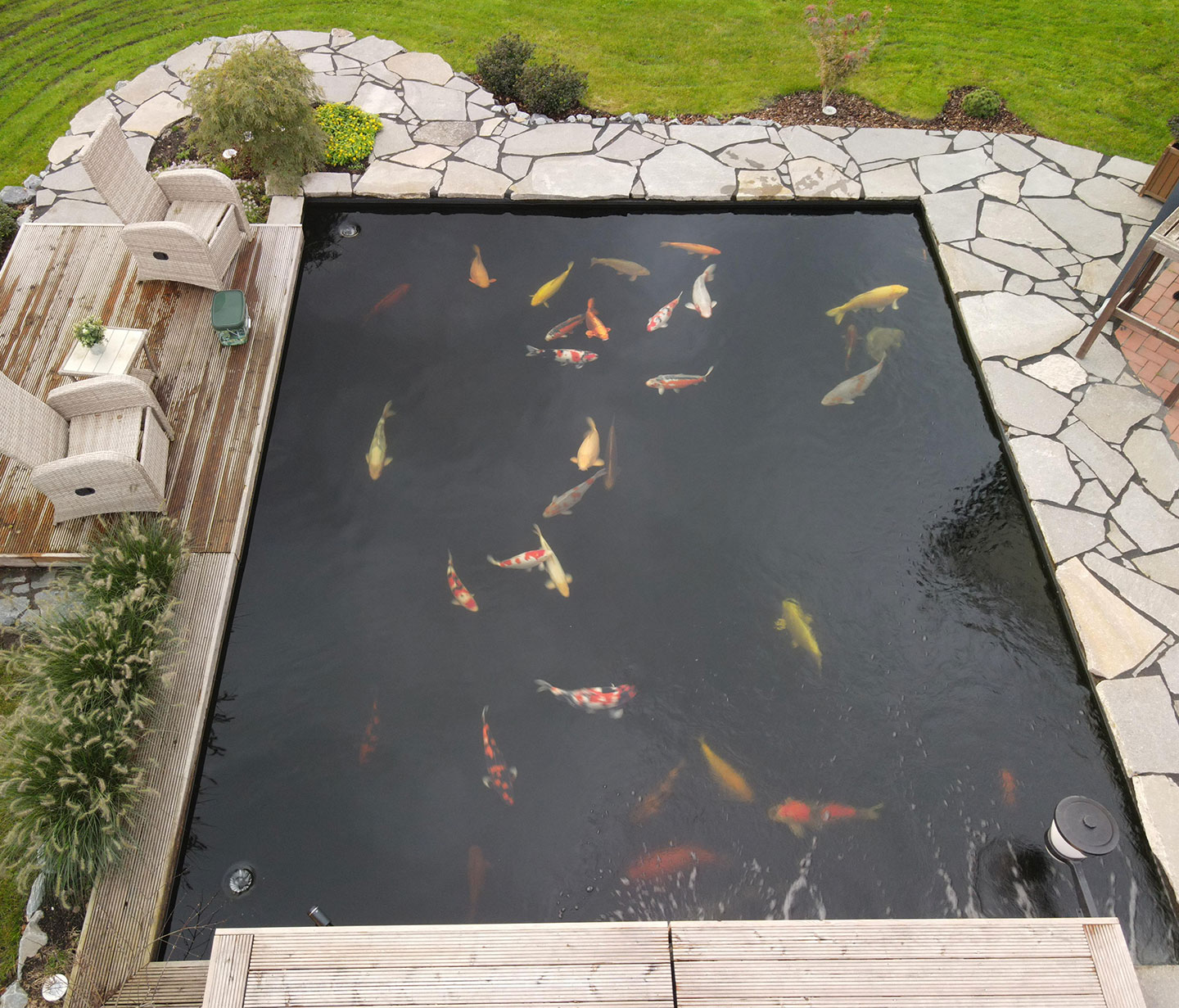 Im Mittelpunkt steht das Wohlbefinden der Koi: Ein leistungsstarkes Filtersystem, abgestimmt auf Teichgröße und Fischbesatz, sorgt für klares Wasser, stabile Wasserwerte und ein biologisches Gleichgewicht – essenziell für gesunde, aktive Fische. Die gesamte Technik wurde dezent integriert, sodass das Gesamtbild ruhig und aufgeräumt wirkt.