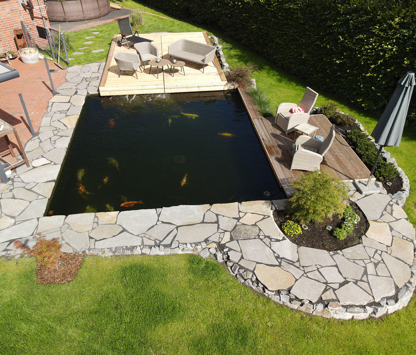 - Teichgröße (LxBxT): 5m x 6m x 1,5m