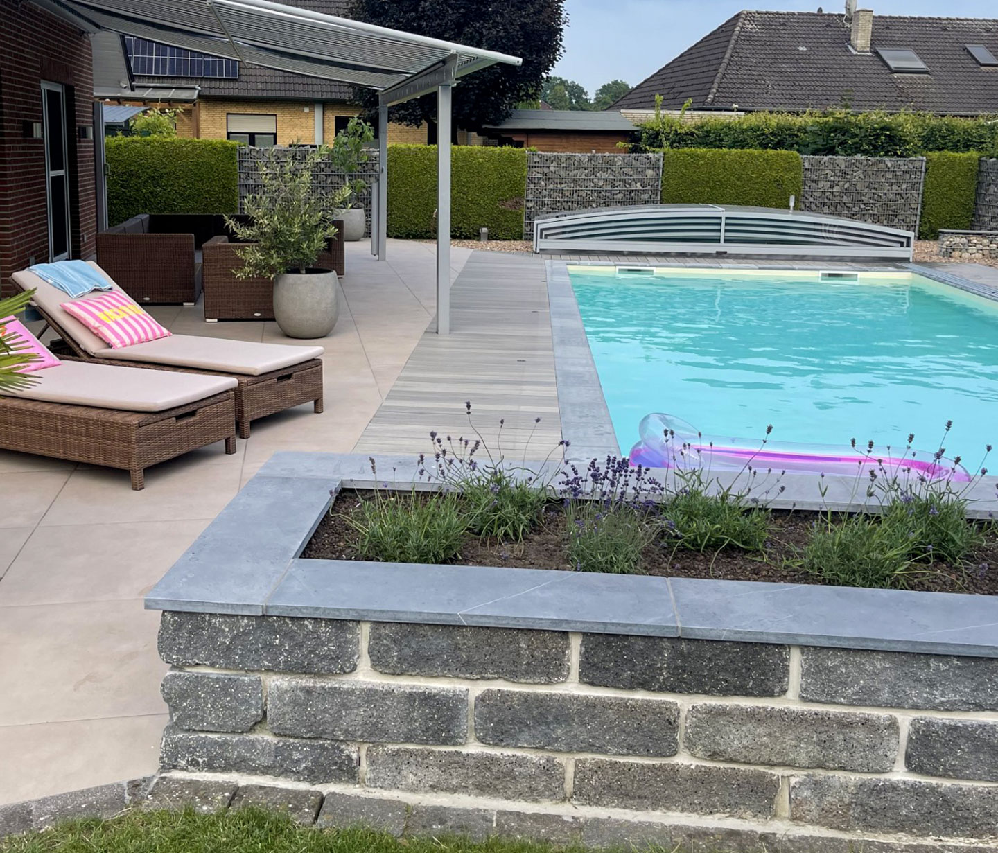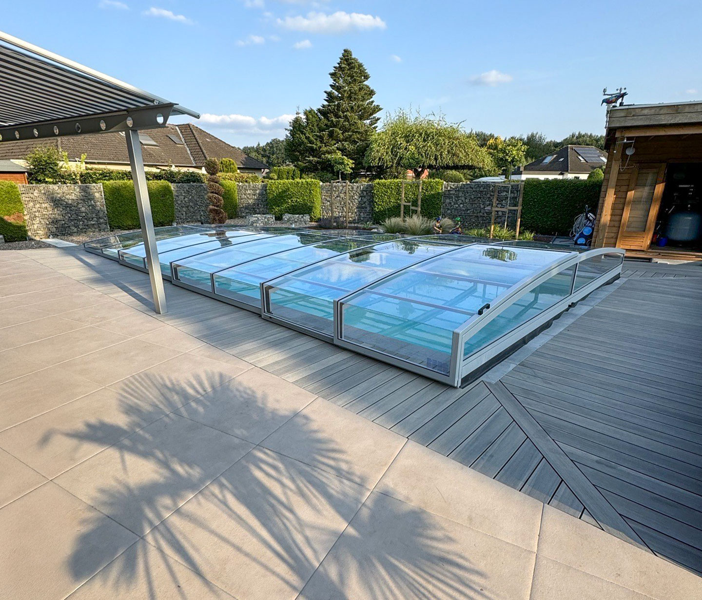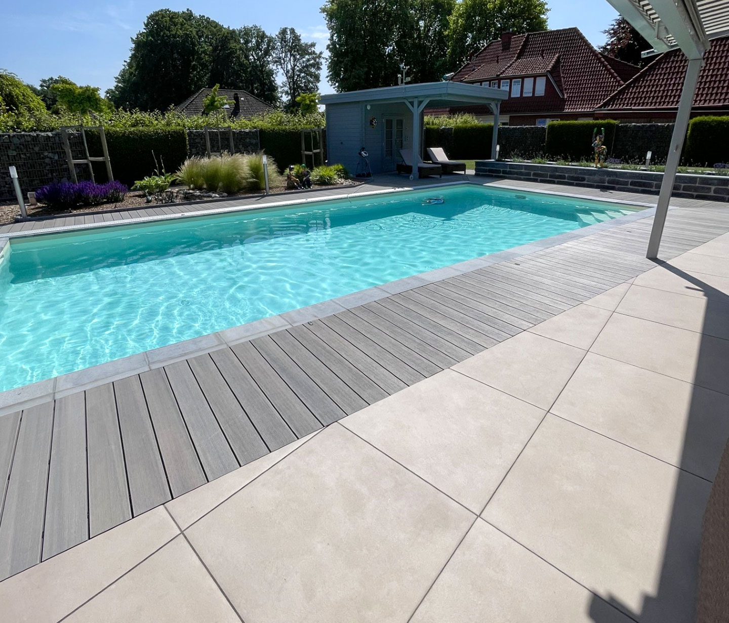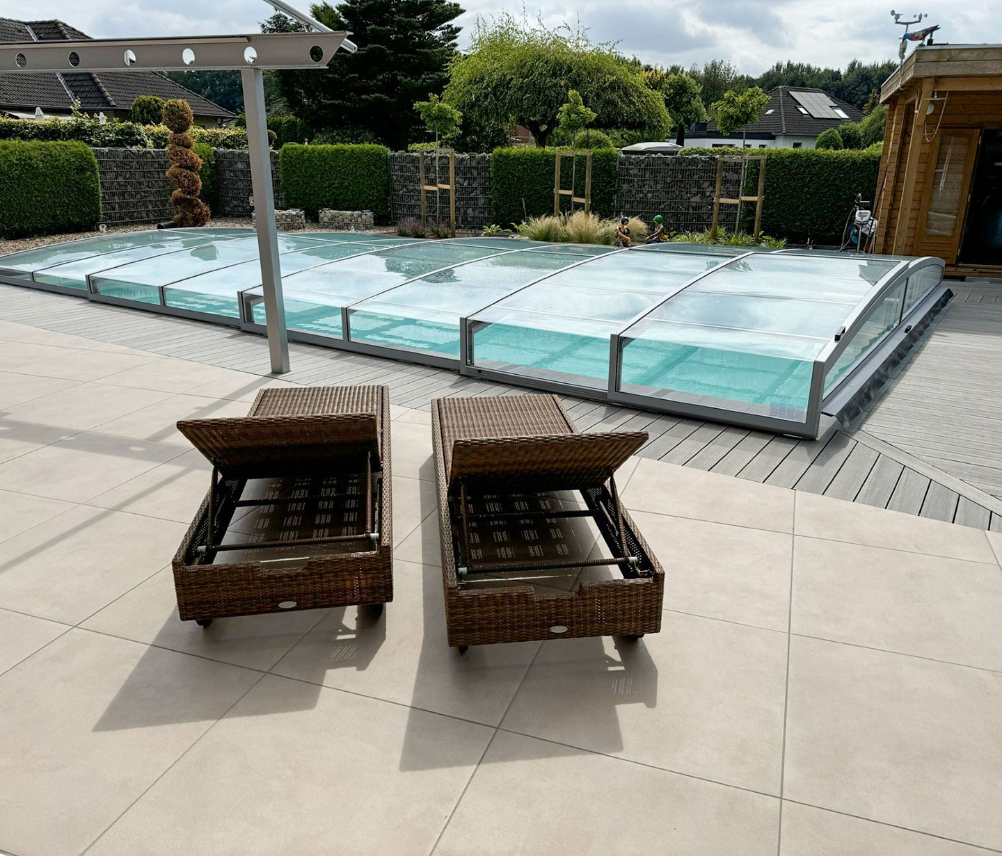 Auch das Poolumfeld wurde stilvoll neugestaltet: Edle Keramikfliesen im Terrassenbereich sorgen für eine moderne, zeitlose Optik, während WPC-Dielen den umlaufenden Poolbereich pflegeleicht und barfußfreundlich gestalten. Eine reduzierte, aber dennoch sorgfältig ausgewählte Bepflanzung rundet das Gesamtbild ab. Ein nach Belieben zuschaltbares, parabelförmiges Wasserspiel aus drei Klarstrahldüsen sorgt für den gewissen Wow-Moment. Die hochwertige Poolüberdachung ergänzt die Anlage funktional und ästhetisch – sie trägt maßgeblich zur konstant hohen Wasserqualität bei und ermöglicht das Schwimmen auch bei wechselhaftem Wetter.